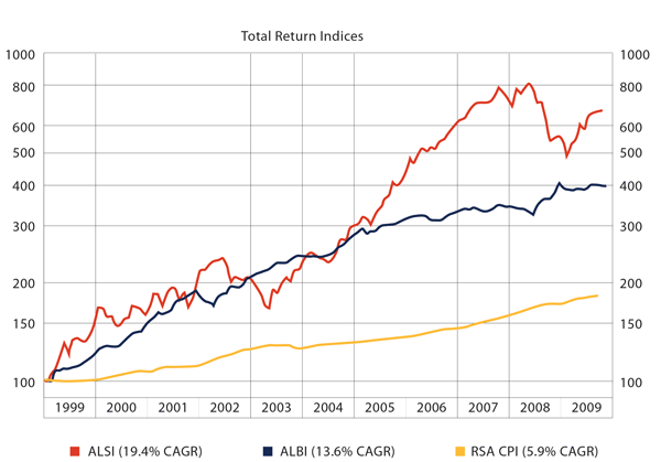 If we consider the graph below, it shows the value of R100 invested in shares, bonds and inflation. Bear in mind that the cash returns will be more or less in line with inflation over time. The red line shows that the R100 invested in shares has grown to almost R700 in 10 years, the R100 invested in bonds (blue line) has grown to R400 over the same period while inflation would have taken the R100 to approximately R180.