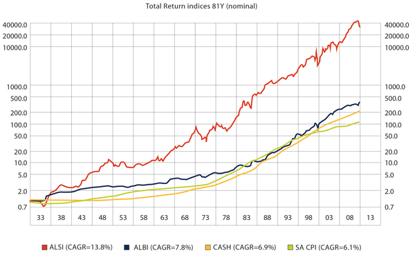 When one considers the same R100 invested over an even longer period in this case 80 years, the outcome is much the same in that shares provide the best long term return than the other types of asset classes.